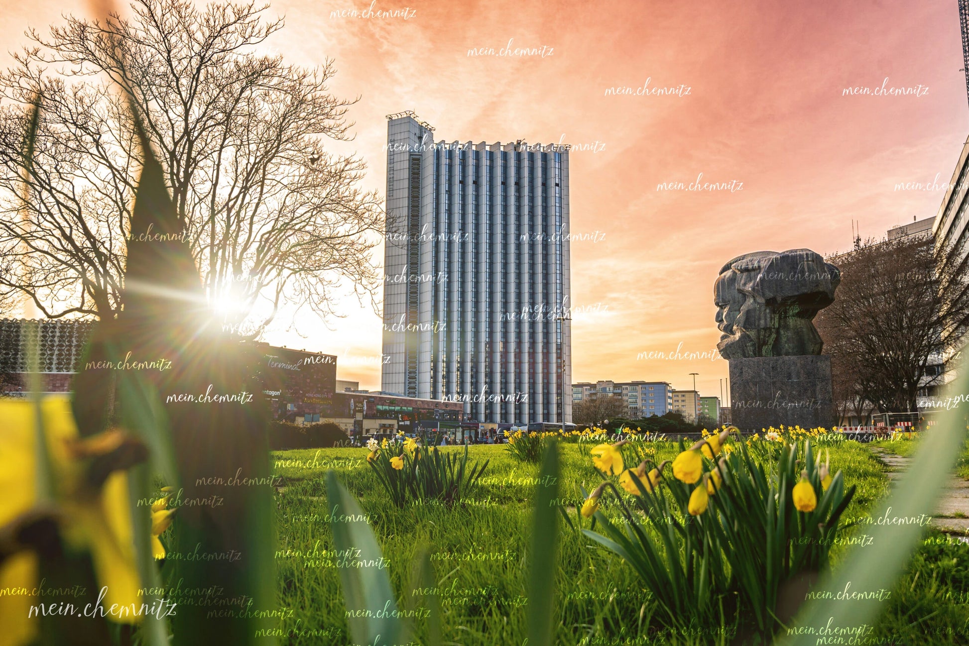 - Kongresshotel mit Karl-Marx-Monument bei Sonnenuntergang